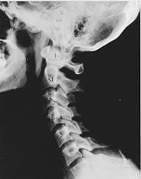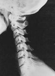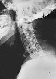 Phase One Subluxation Degeneration is seen in subluxations that have been present for up to twenty years. This phase is characterized with a loss or change in the normal curve in the spine. On this example you can see that the normal forward (lordotic) curve is lost. This spine even has developed a reverse curve in the neck. The disc spaces have also begun to exhibit a slight change in shape. One good point is that the bodies of each of the vertebrae (the square part in front) still exhibits clean clear borders. Segmental motion may be abnormal but overall motion is probably not affected. Chiropractic reconstructive care for a phase one can take from 6 to 18 months. More than 80% of people with Phase One Subluxation Degeneration have no pain. Therefore, if left uncorrected, phase one continues to progress with time until it eventually reaches the next phase.